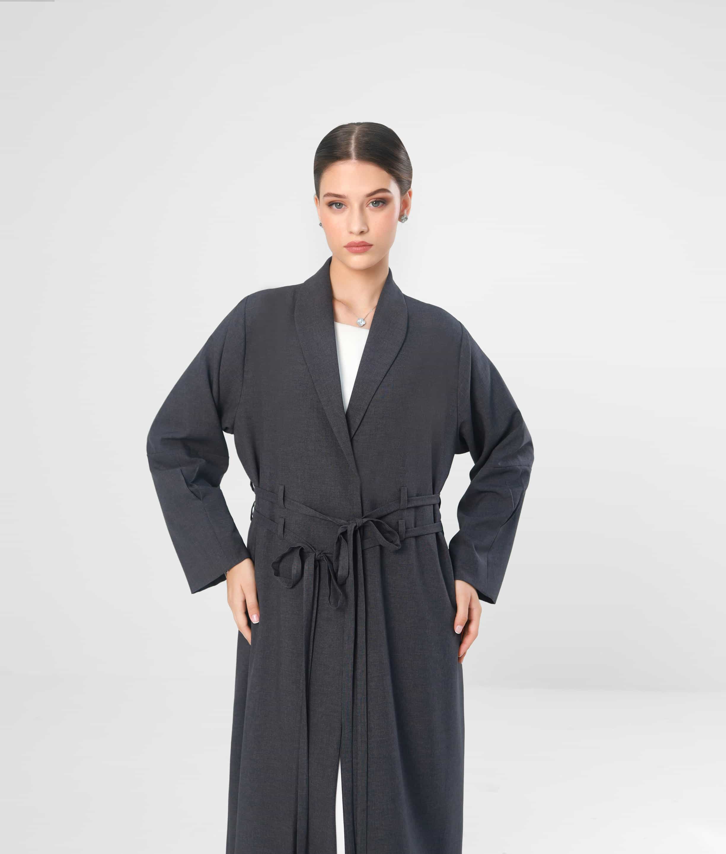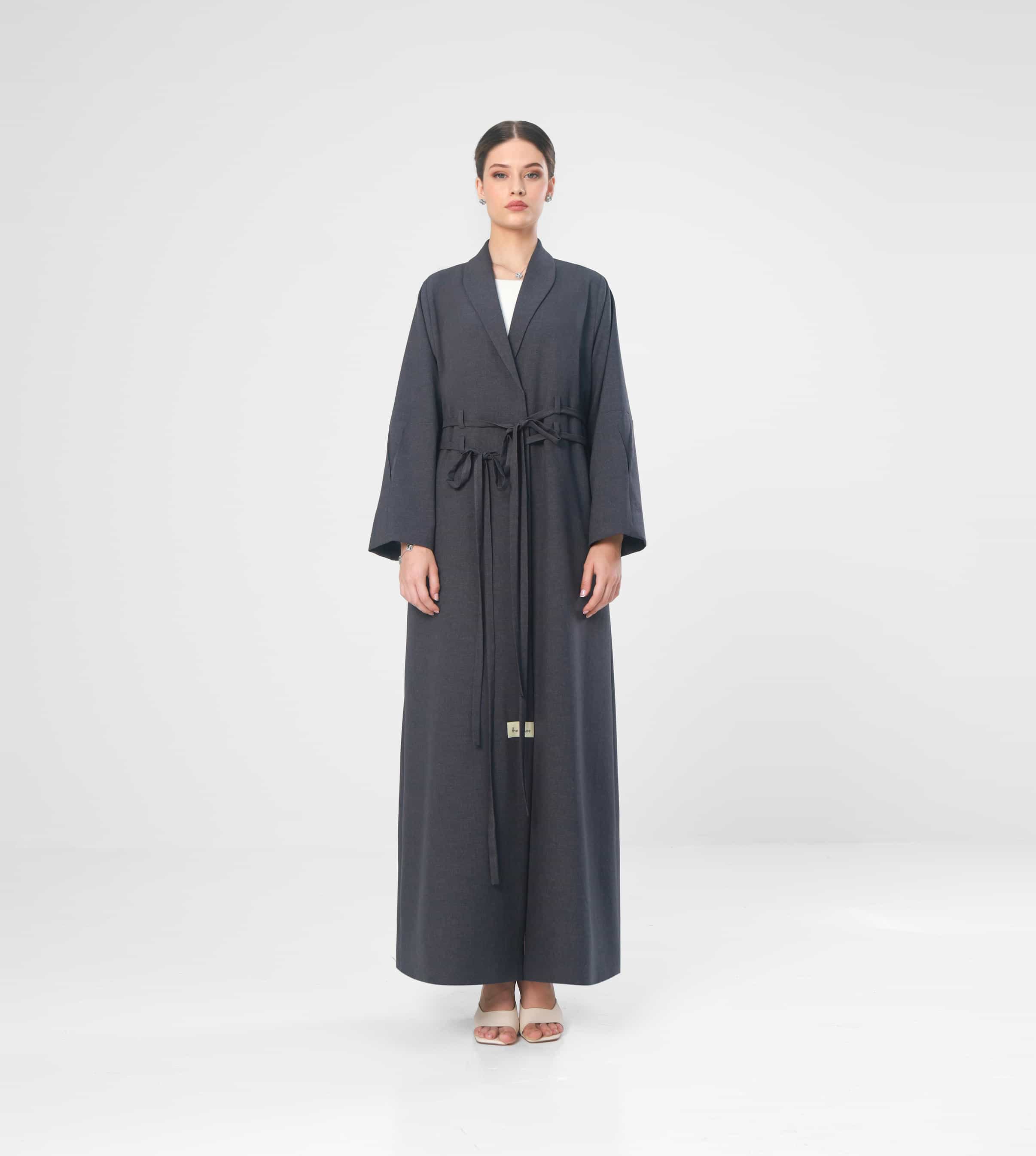 Charcoal grey abaya with a flattering wrap-style design with an adjustable tie belt that cinches the waist for a customizable fit. Made from premium suiting fabric.