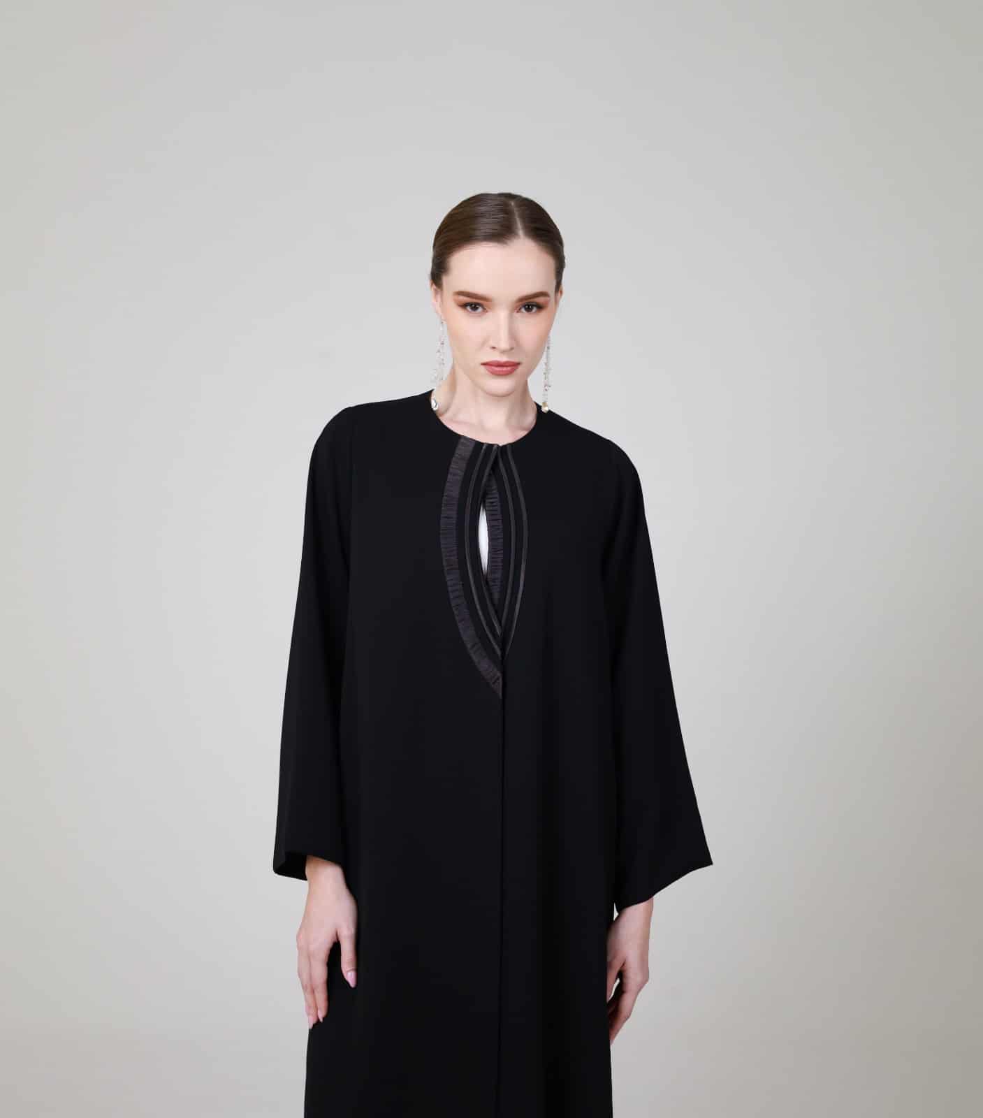 Black Abaya with Ruffled fabric details in the neckline, delicate pleated trim in a matching black fabric making it sophisticated elegant