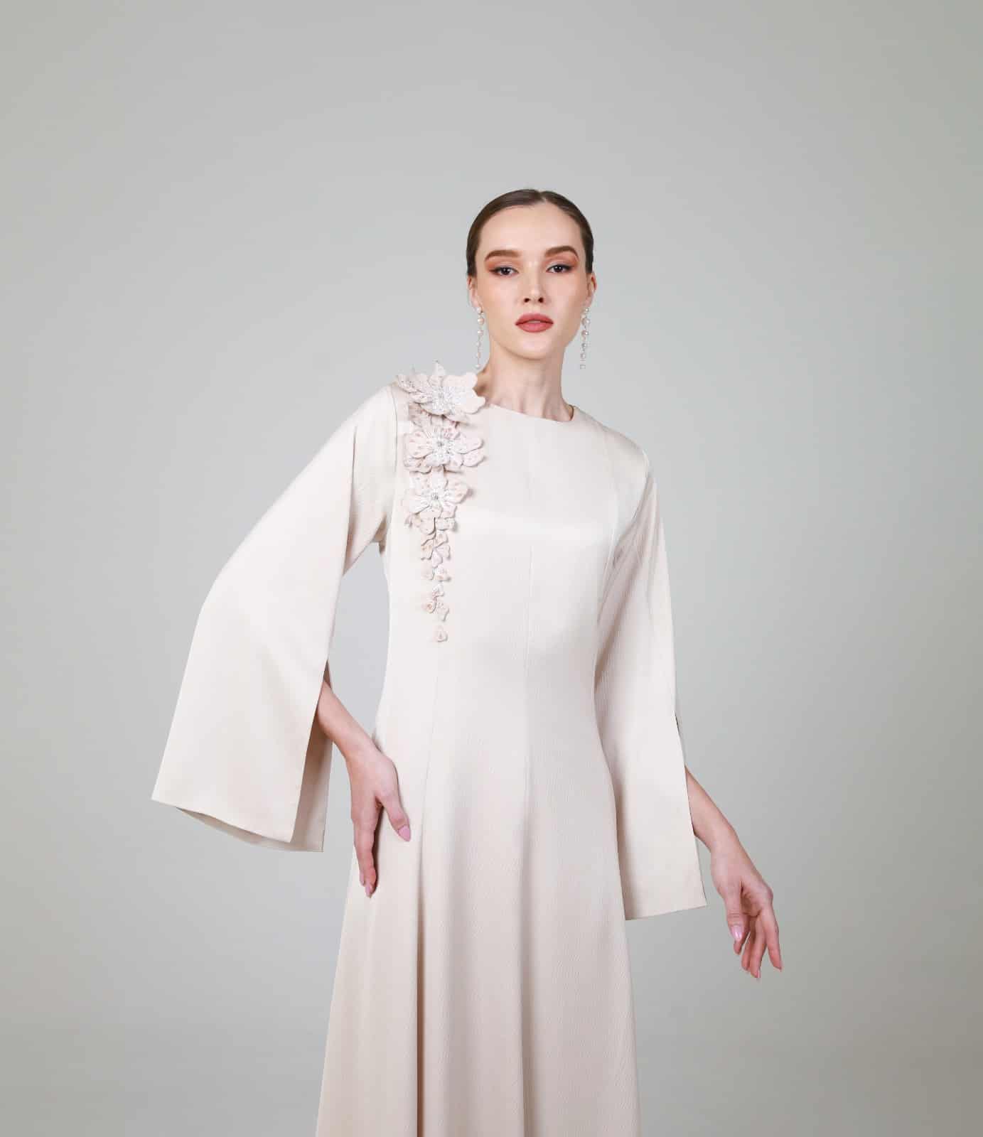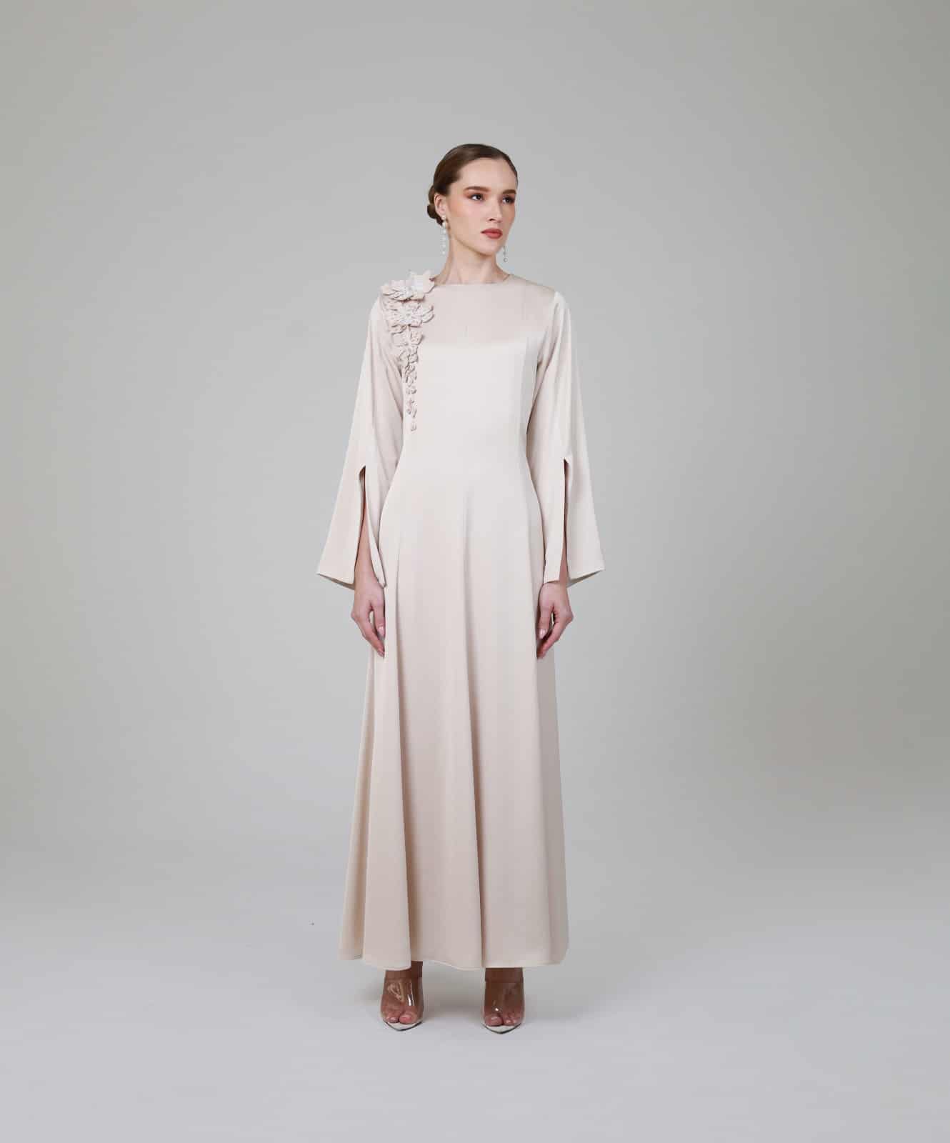 Beige Kaftan with Subtle slit sleeves, and delicate floral appliqué with soft bead detailing cascades from the shoulder, creating a feminine and sophisticated accent