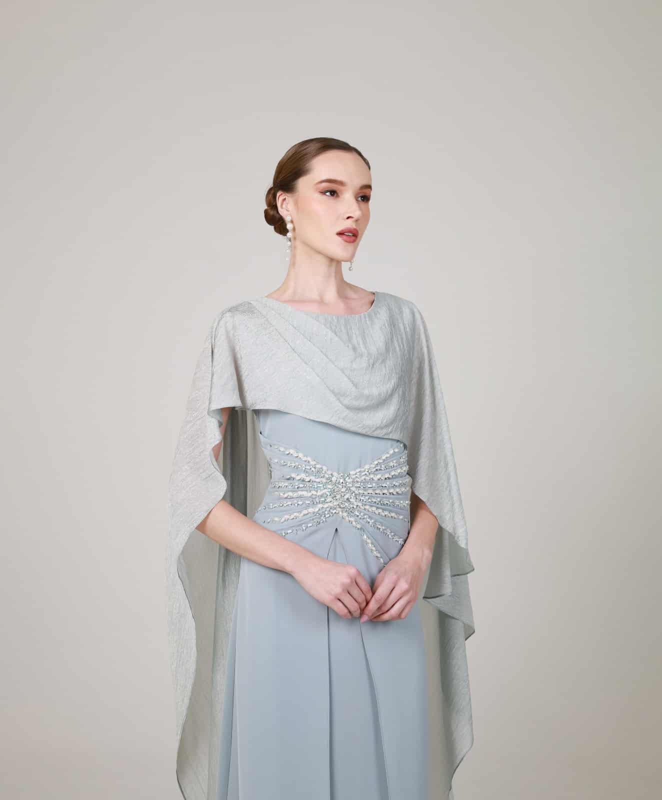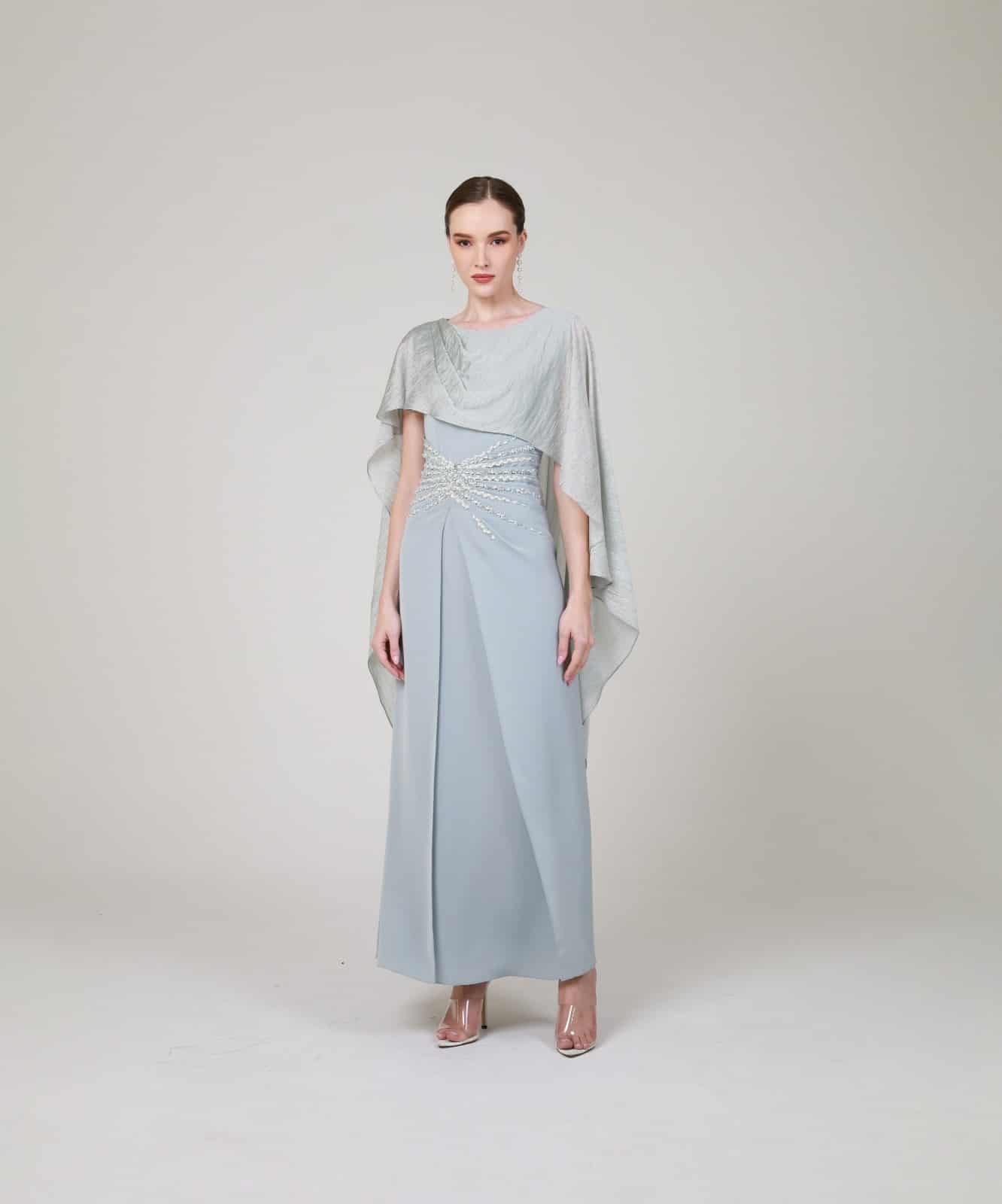 Pale sage Green Kaftan features a breathtaking combination of delicate color, fluid draping, and intricate beading, embodying modern elegance