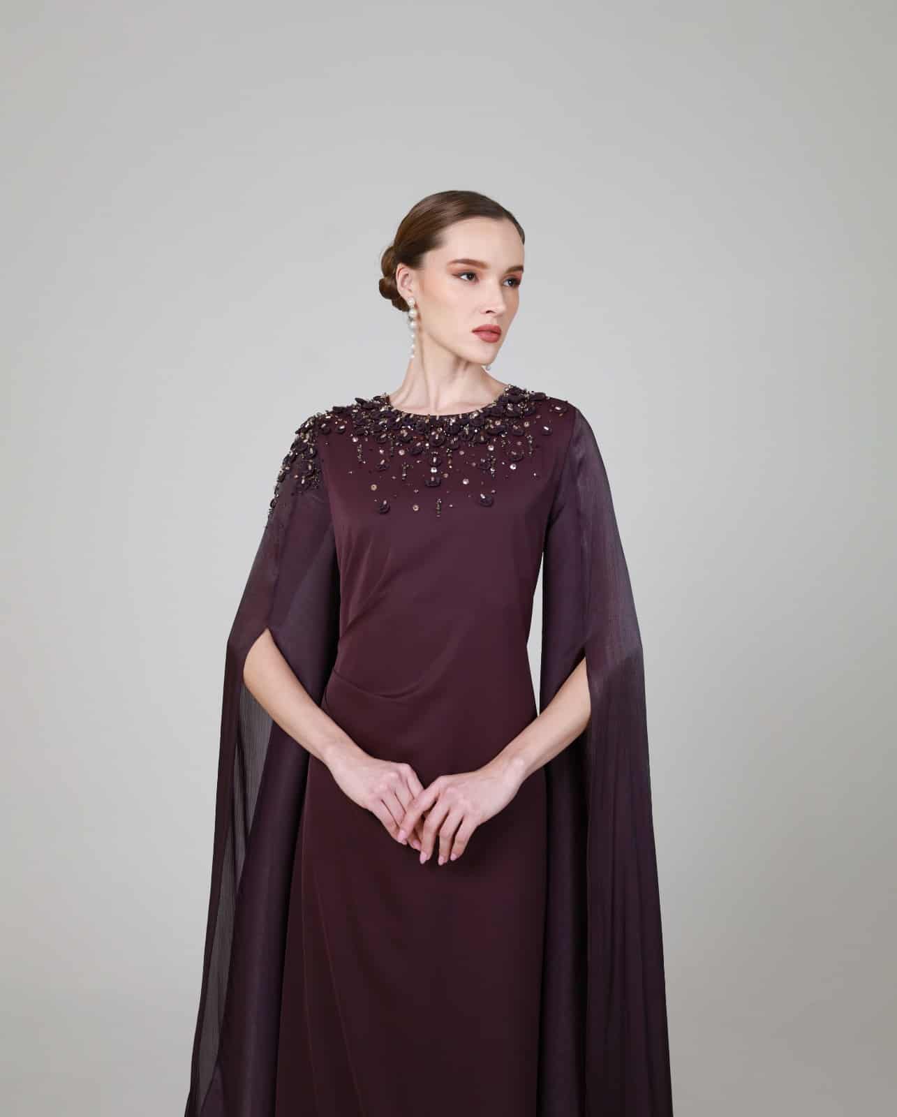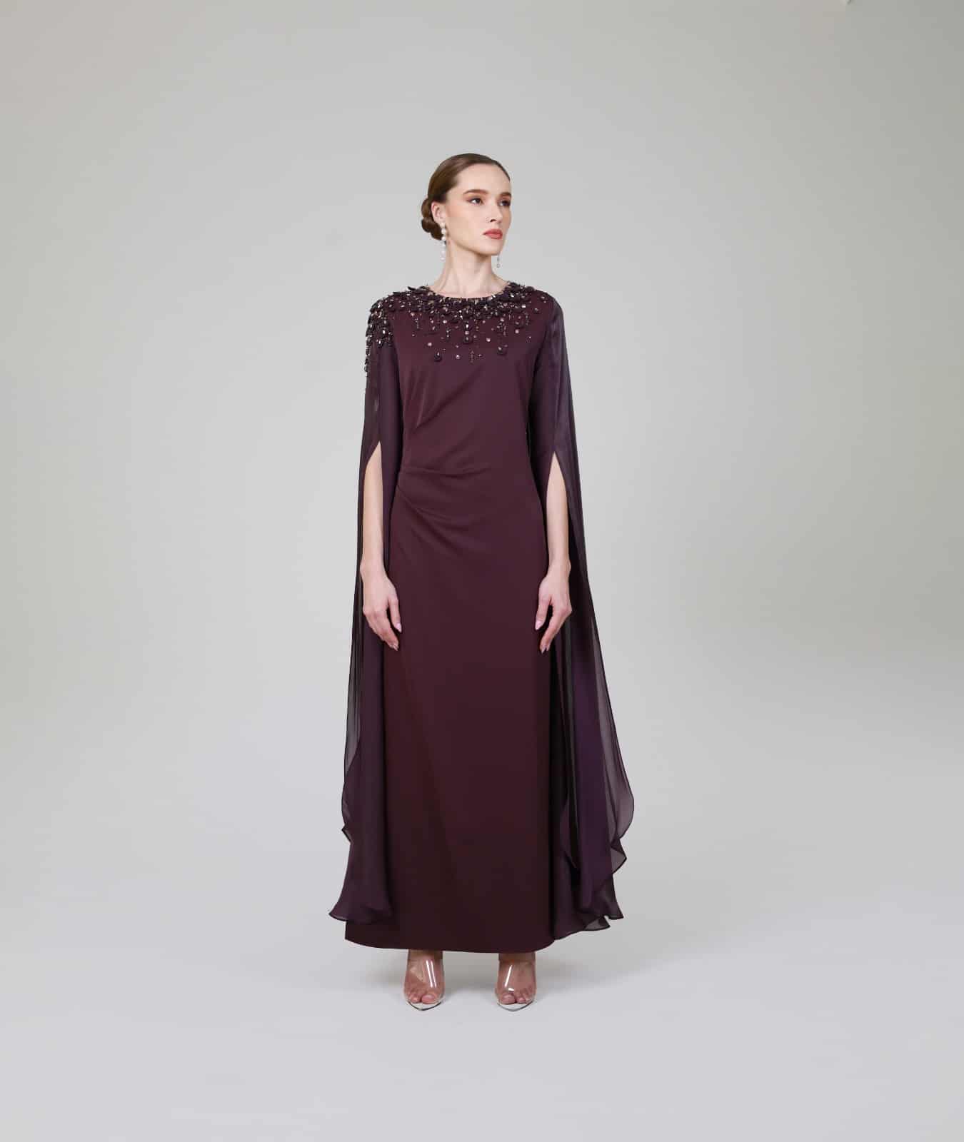 Regal Plum Kaftan with Embellished Cape Sleeves adorn with a dense cluster of dark, shimmering beads and sequins, creating a jeweled collar effect.
