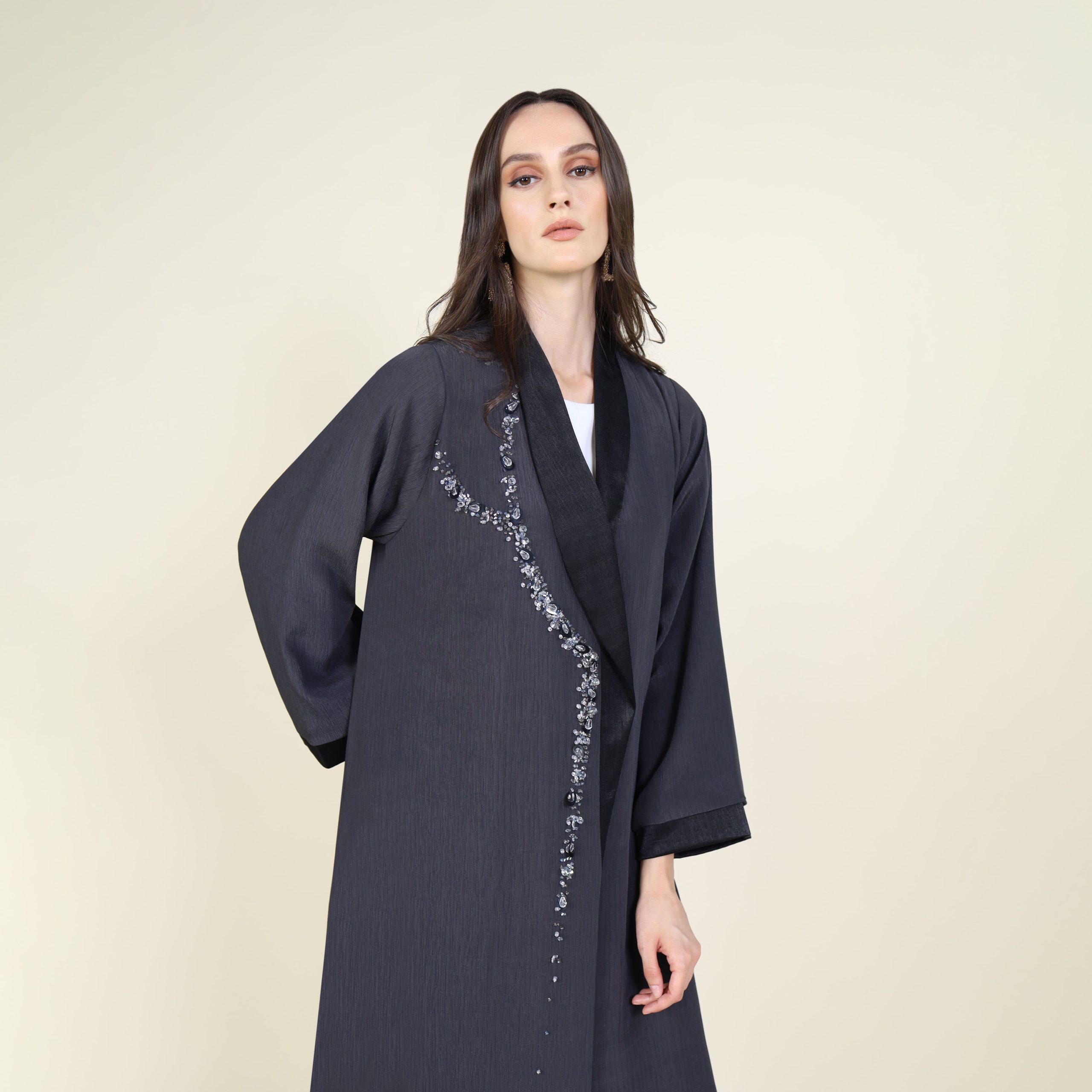 Colored Purple Abaya with black details and hand embroidery in front with fabric buttons.