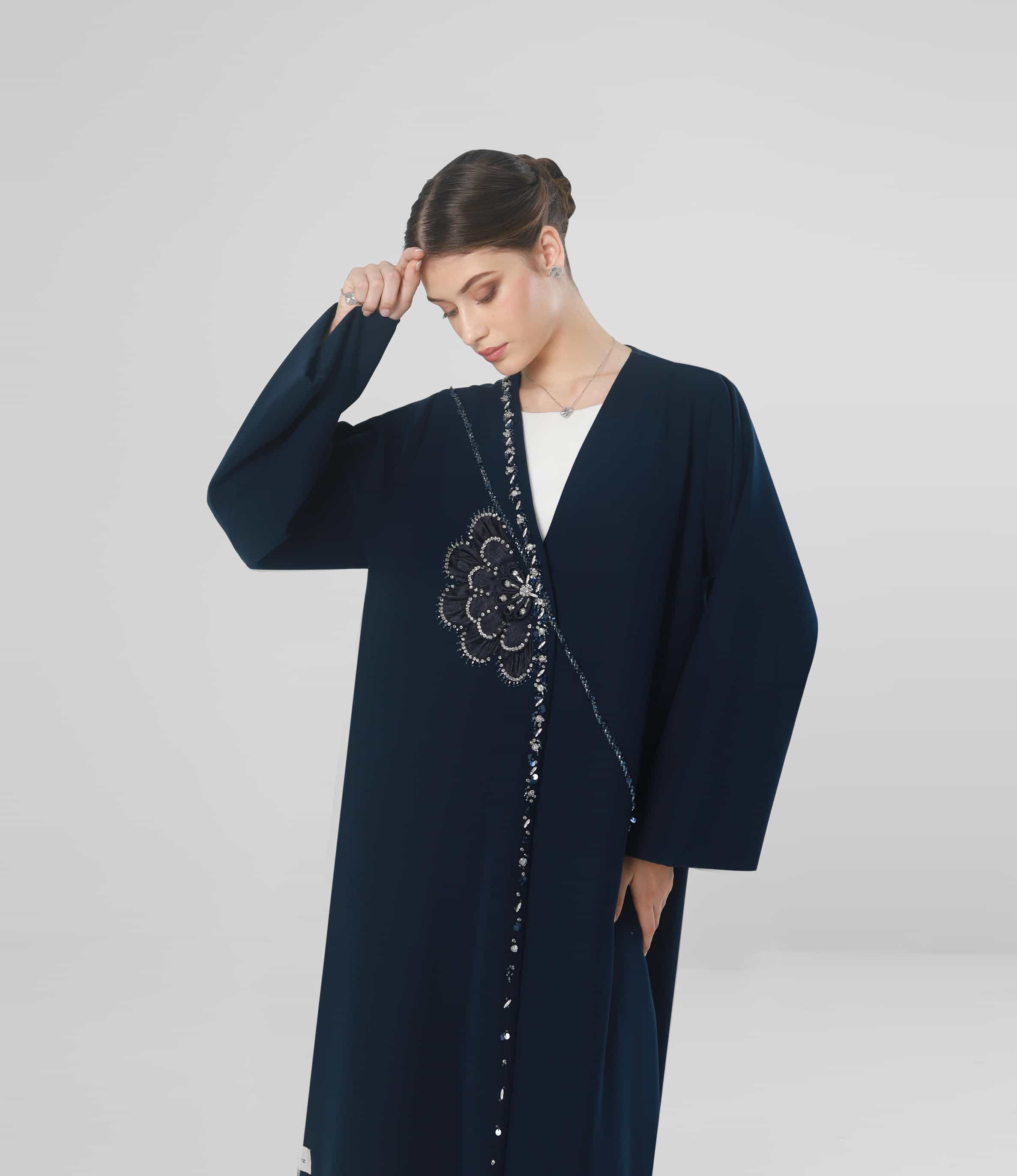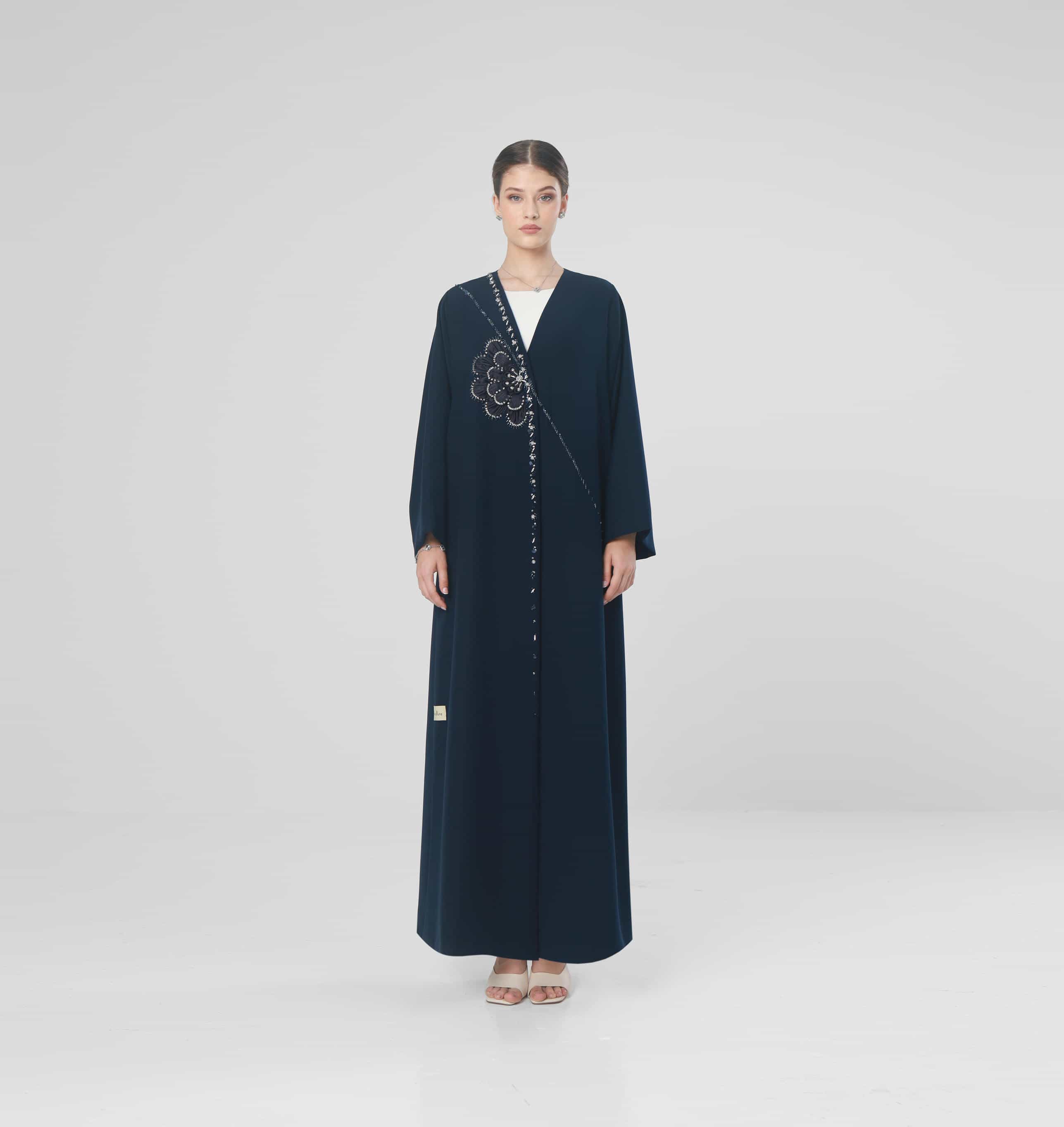 Elegant Navy Blue features a delicate Navy blue Floral with intricate crystal and beadworks along the front. Crafted from lightweight crepe for a sleek silhouette