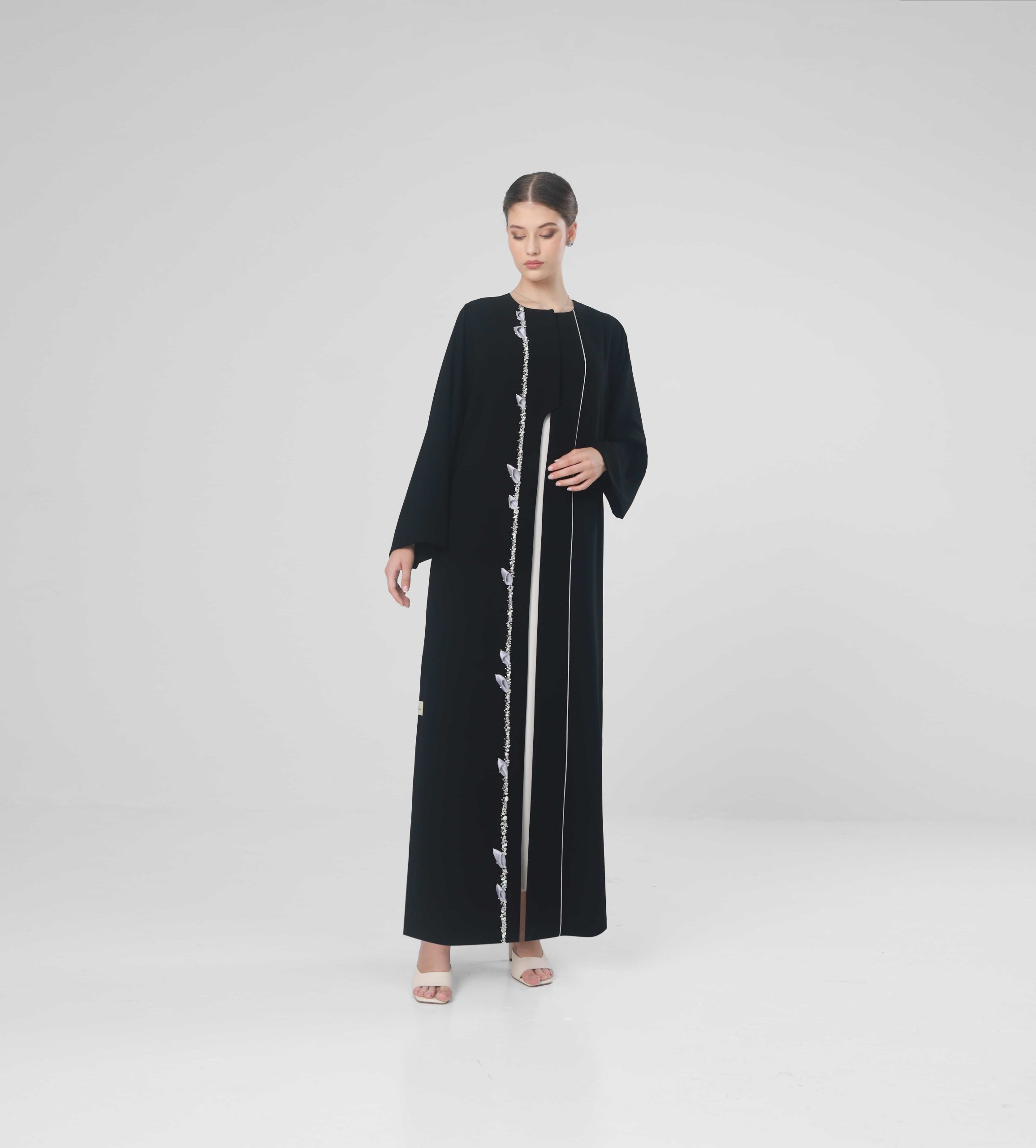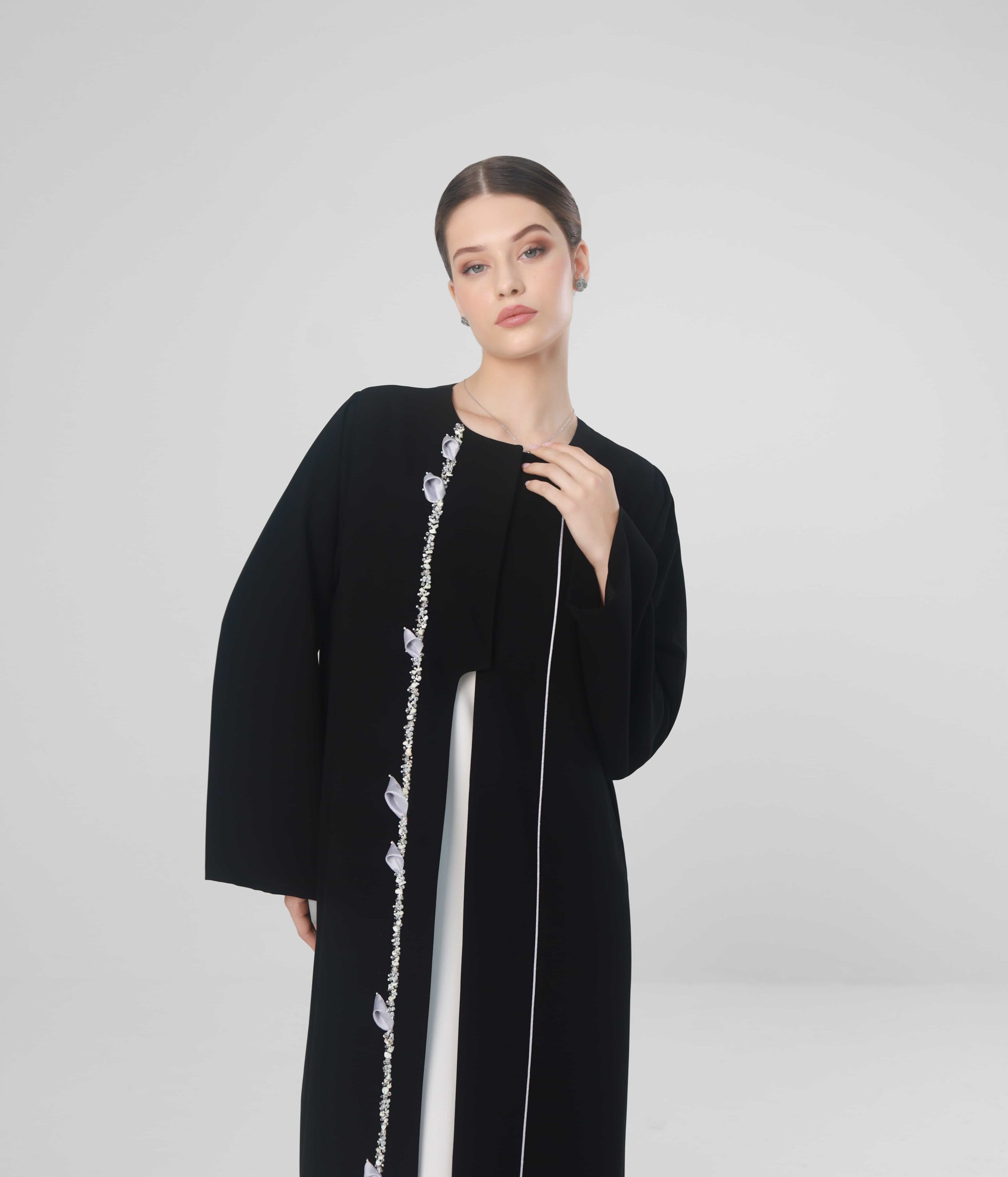 Black Abaya with the sleek silhouette enhanced with vertical floral embellishment of grey petals and beadworks