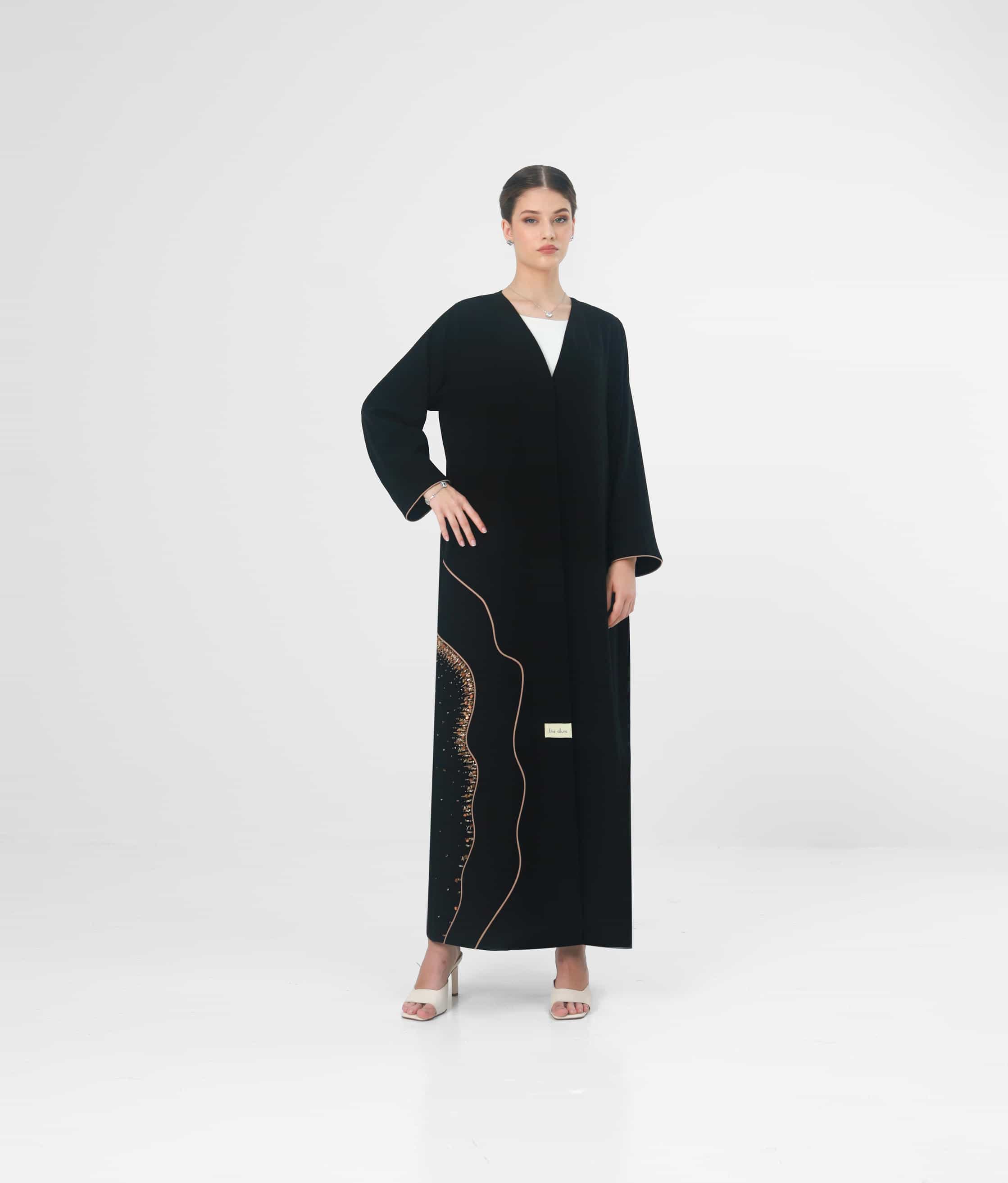 Black Abaya featuring soft nude piping and wavy embellished panel with delicate beadwork along one side, modern, artistic edge to classic modest wear