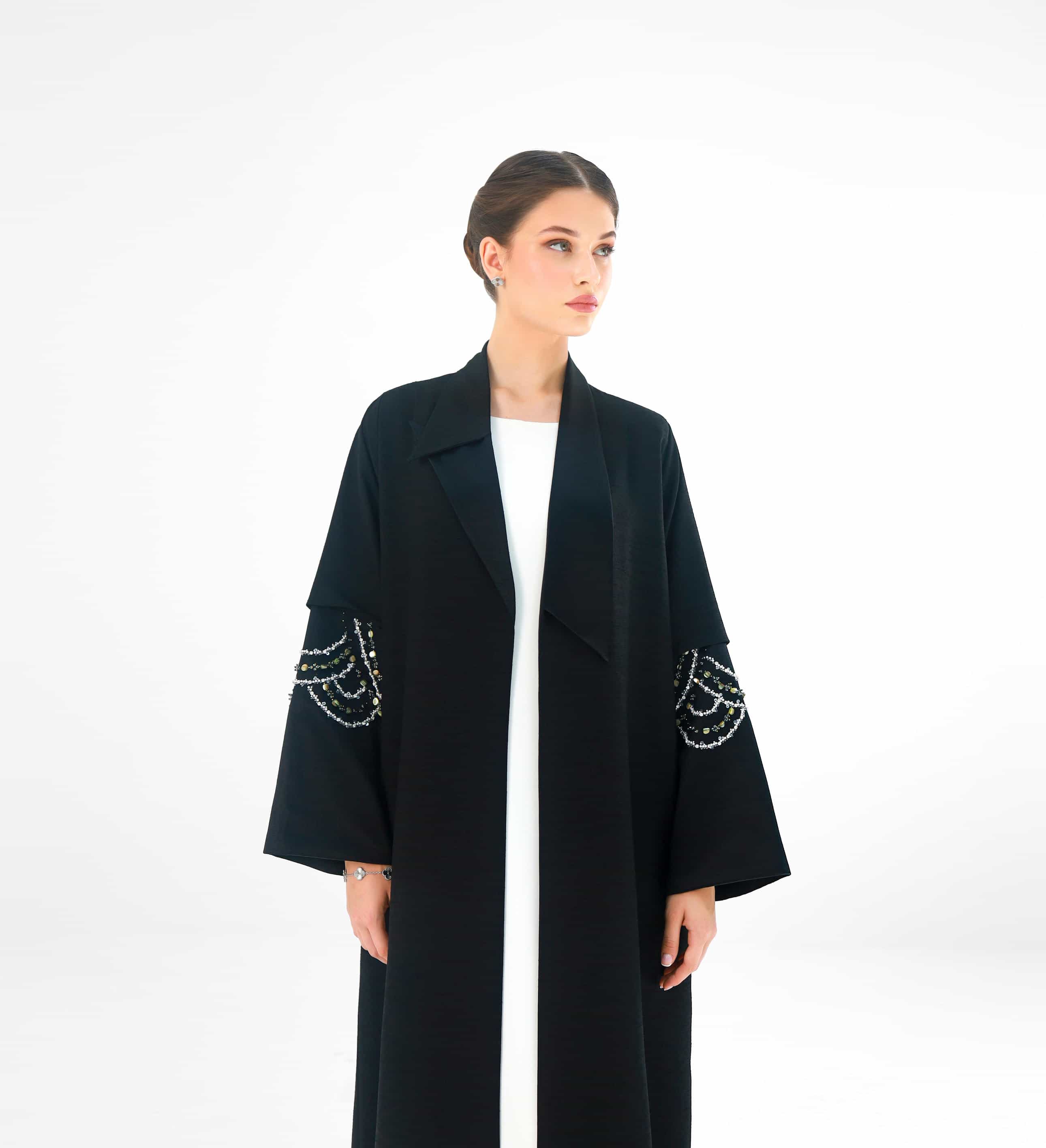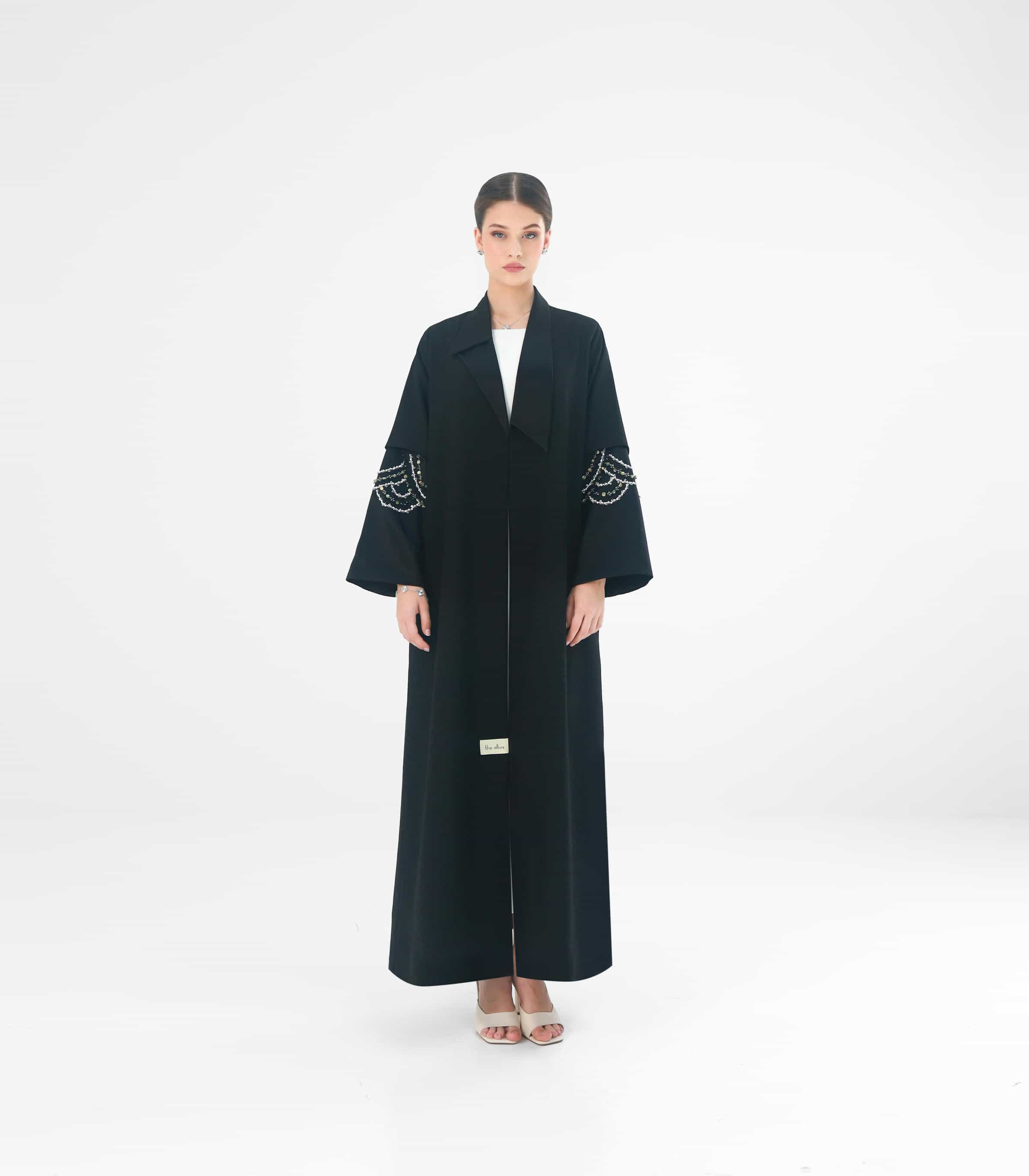 Black Abaya, featuring intricate beaded detailing on the sleeves. Provides a classic elegant drape.