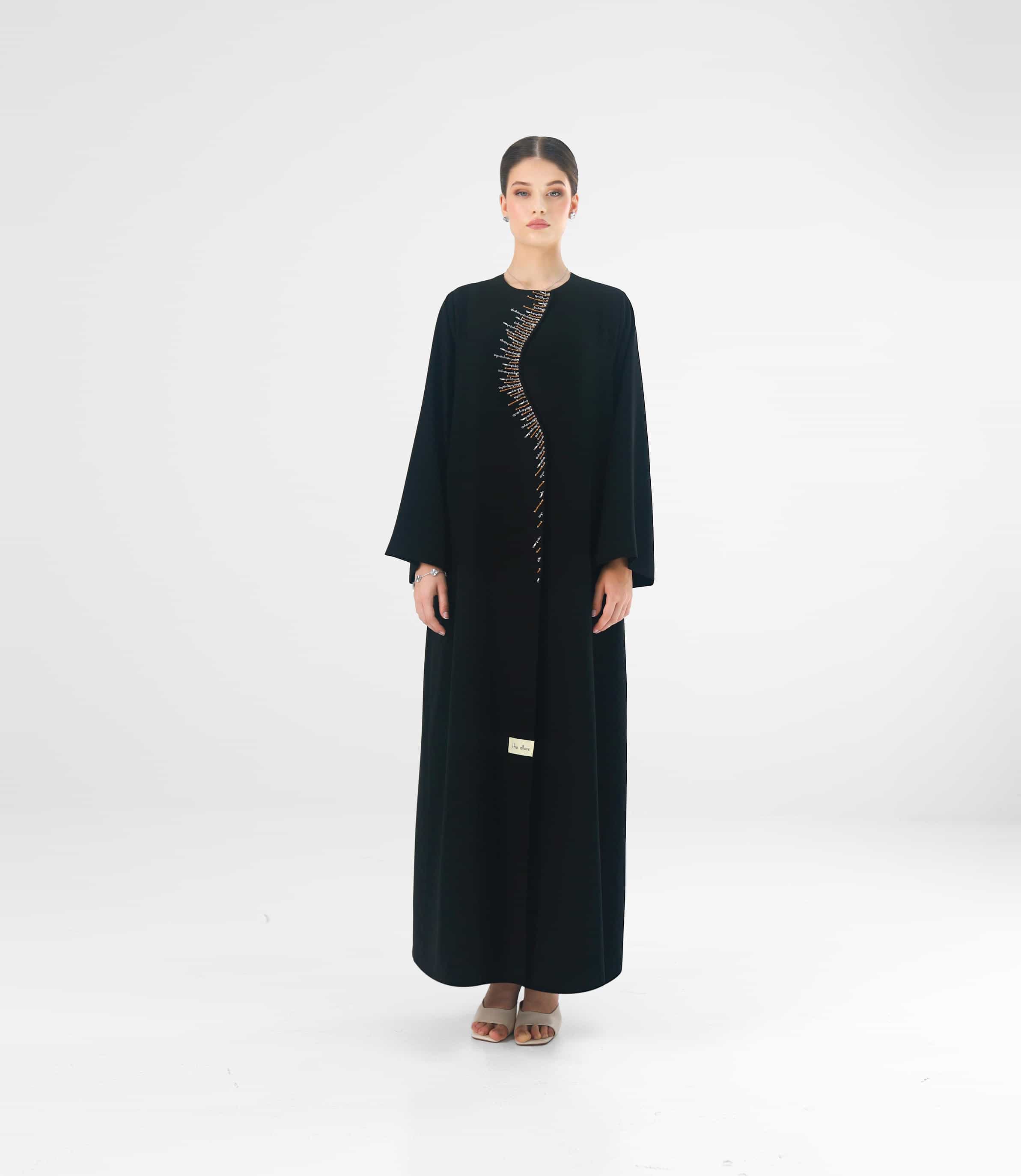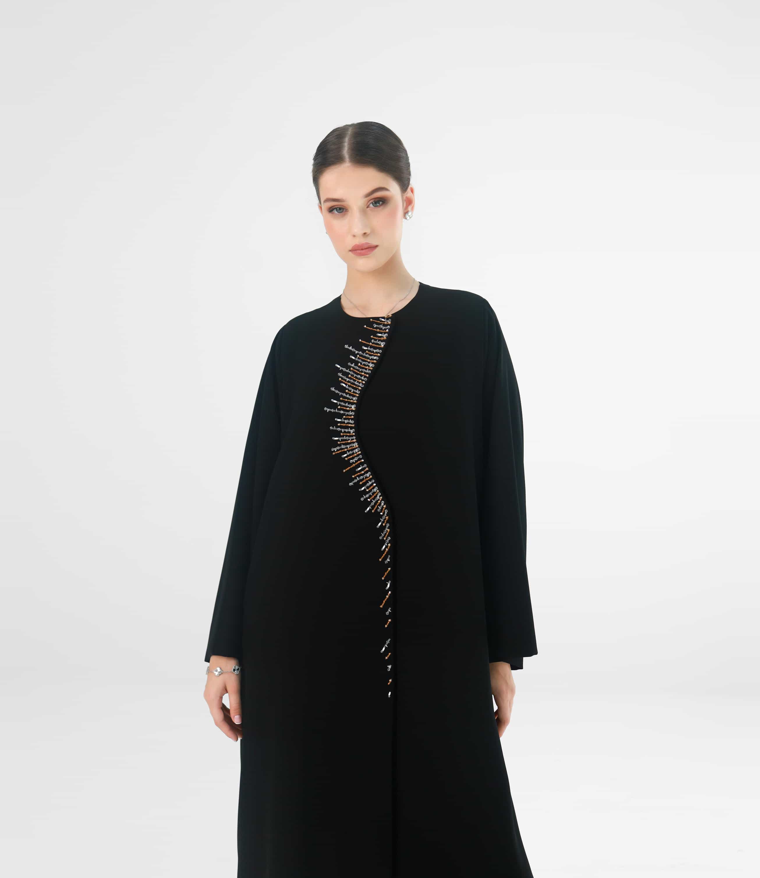 Elegant black abaya, featuring a striking wave-shaped front design adorned with intricate hand embellishments in silver, copper, and crystal tones.
