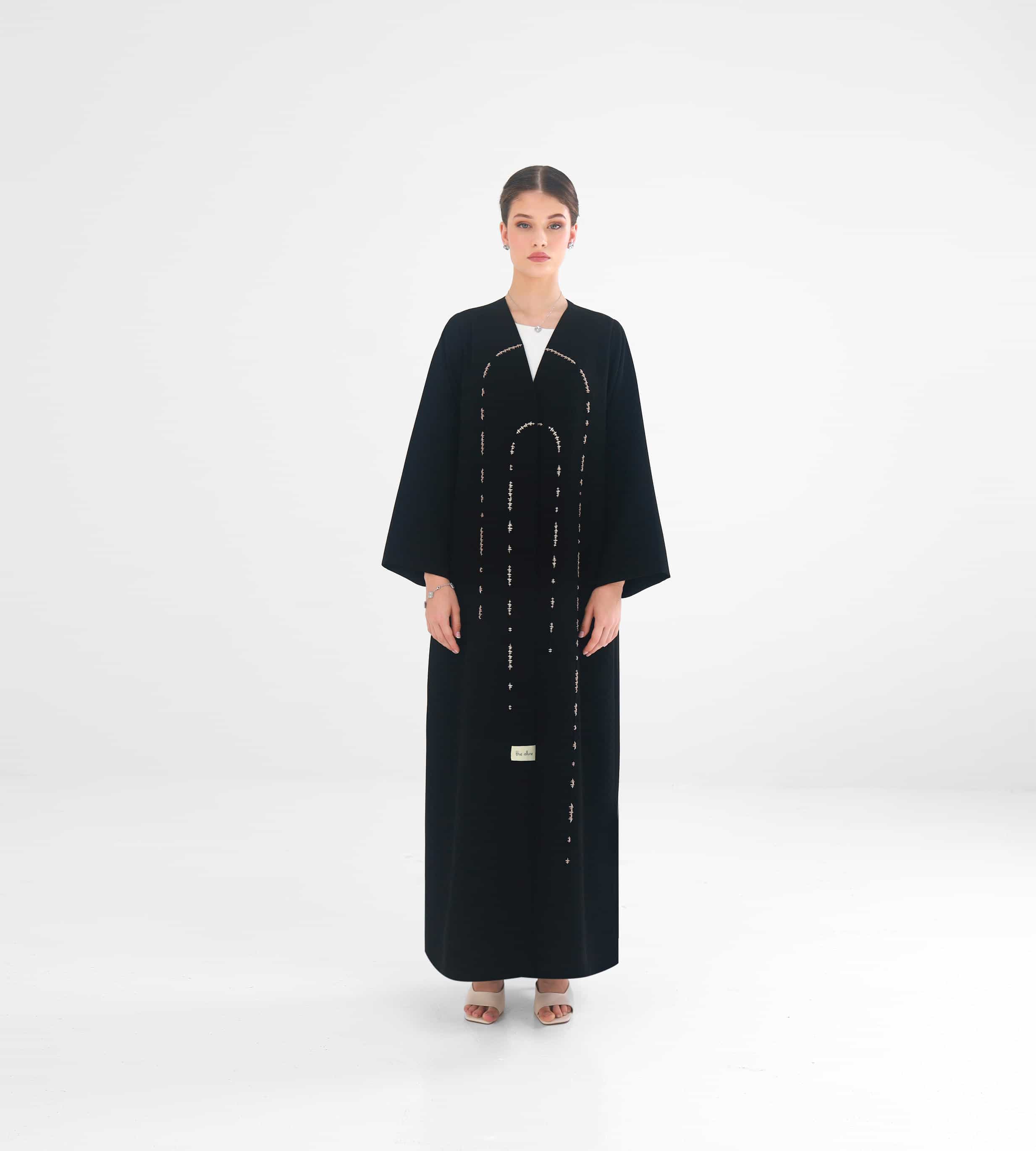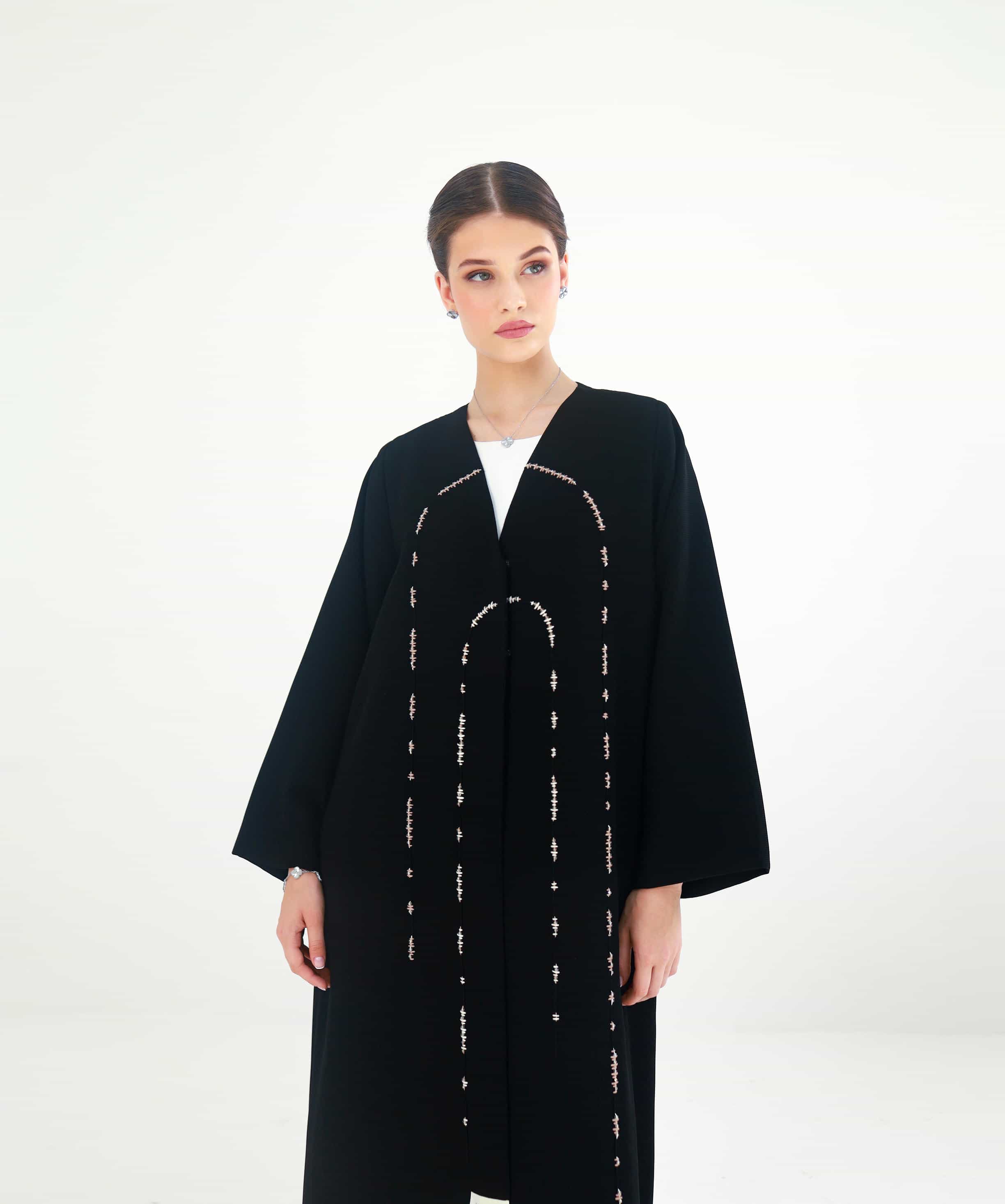 Black abaya featuring elegant rose-gold embellishments in a symmetrical arch pattern, adding a subtle yet striking touch of sparkle beads and threadworks