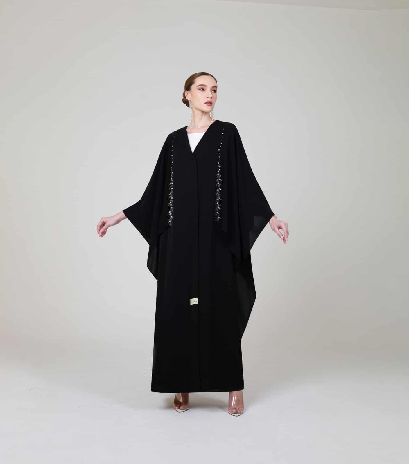 Black Abaya, Minimalist front enhanced by two vertical lines of delicate crystal, subtly placed to add refined sparkle the design with Wide, flowing cape sleeves.