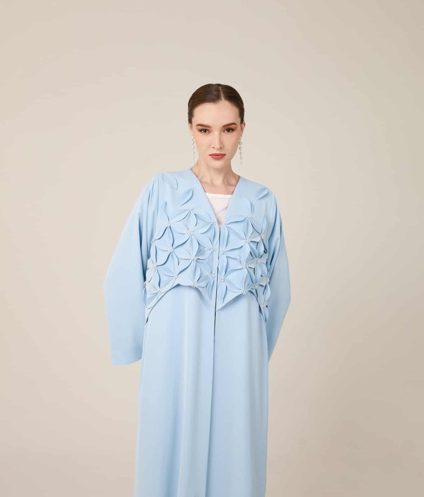 Sky Blue Floral Embellished Abaya a modern femininity, featuring a delicate color and unique dimensional detailing that creates a fresh, artistic look.