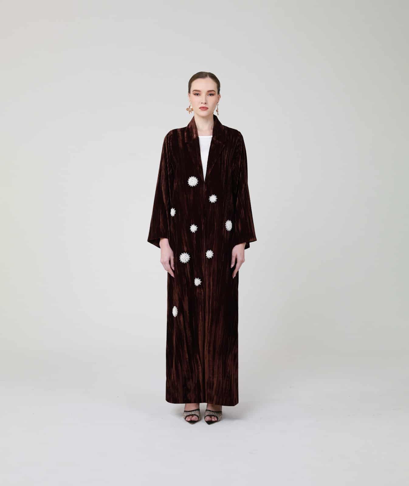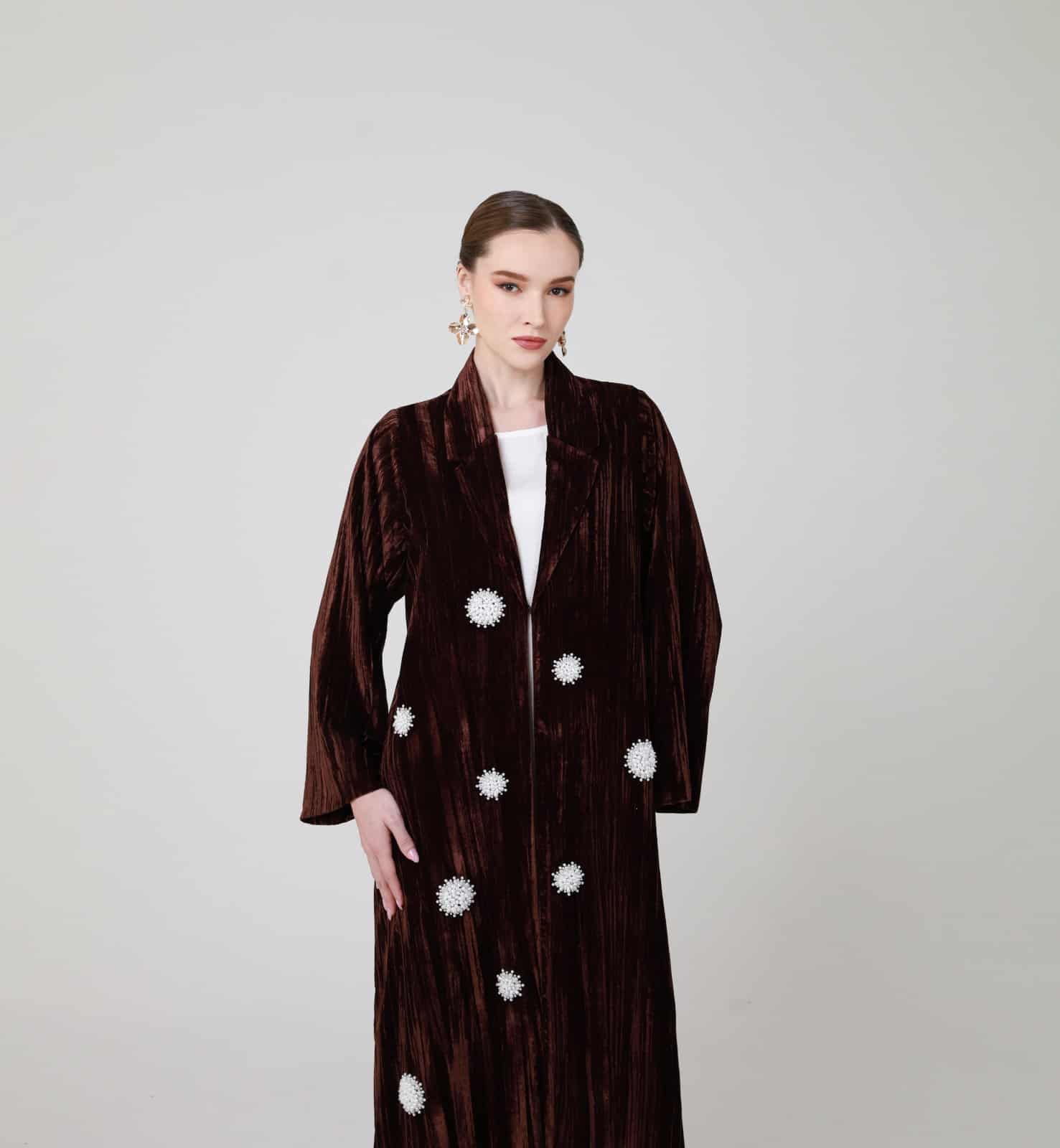 Velvet Abaya with Floral Appliqué a statement of opulent texture and rich color, designed to warmth, modesty, and distinctive style for cooler seasons or events