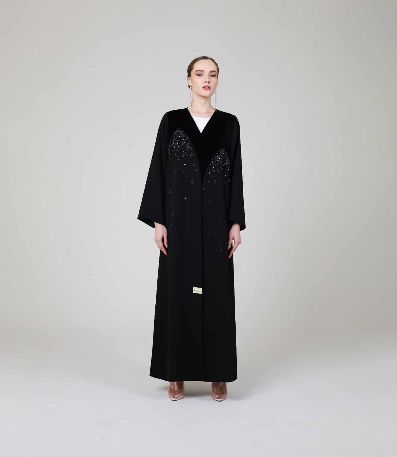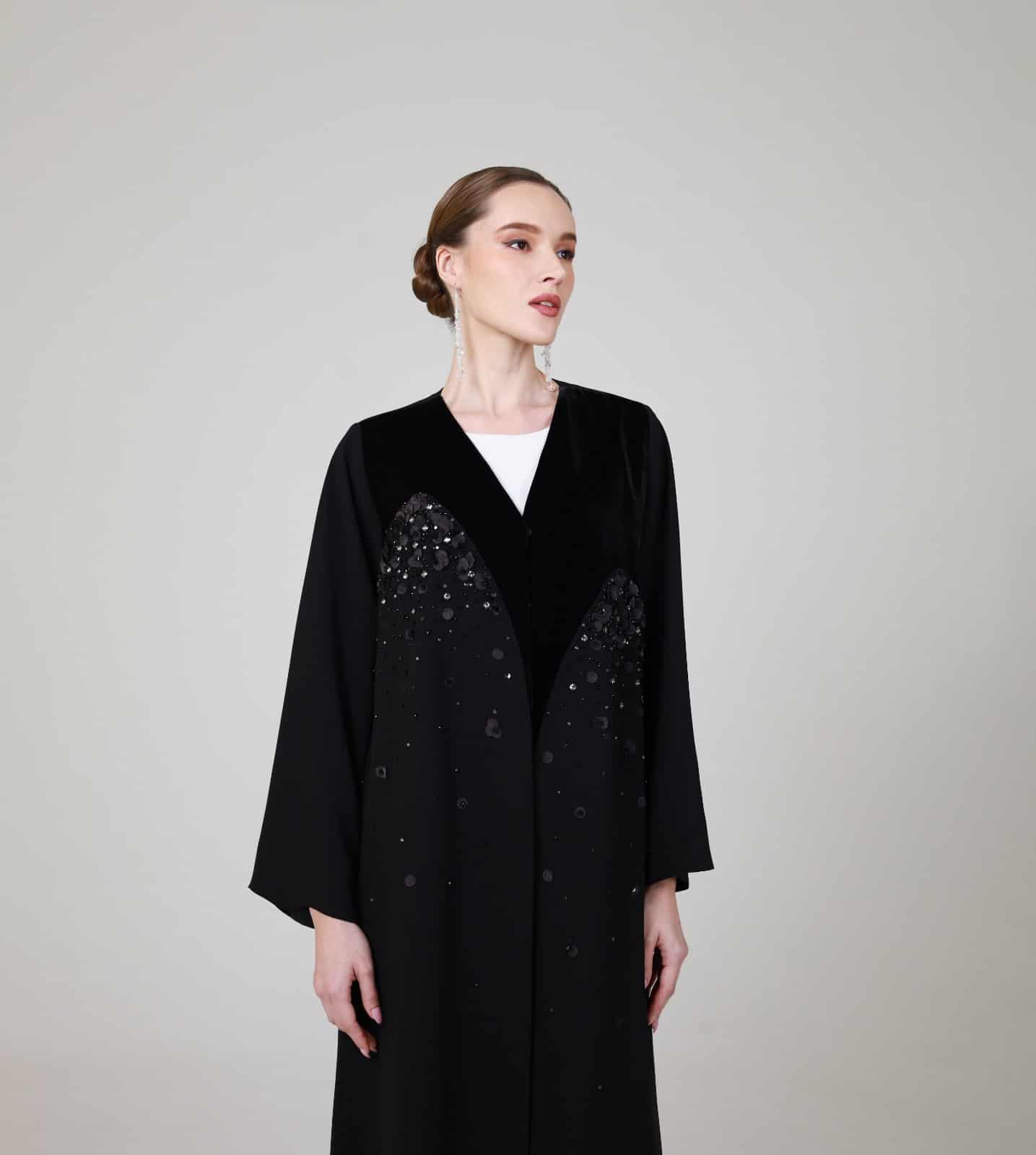 Black Abaya with Velvet a sophisticated blend of luxurious textures and sparkling detail with scattered black sequins and beads.