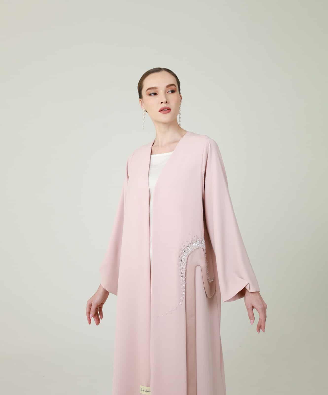 Blush Pink Satin Abaya a feminine abaya combines soft blush tones with shimmering embellishment and textural contrast for a delicate yet glamorous