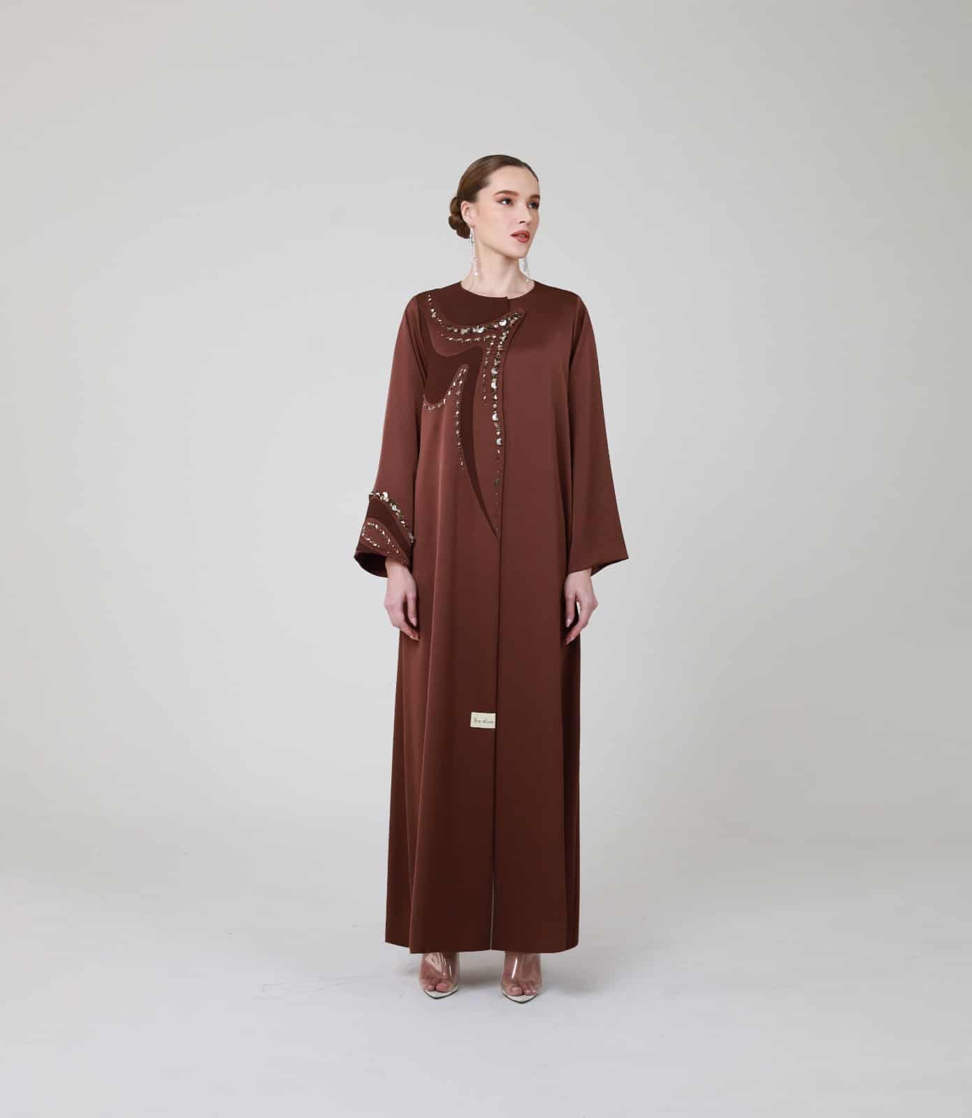 Rich brown Abaya with sequins is a stunning statement piece with curved overlay in a matte texture that contrasts with the glossy main fabric.